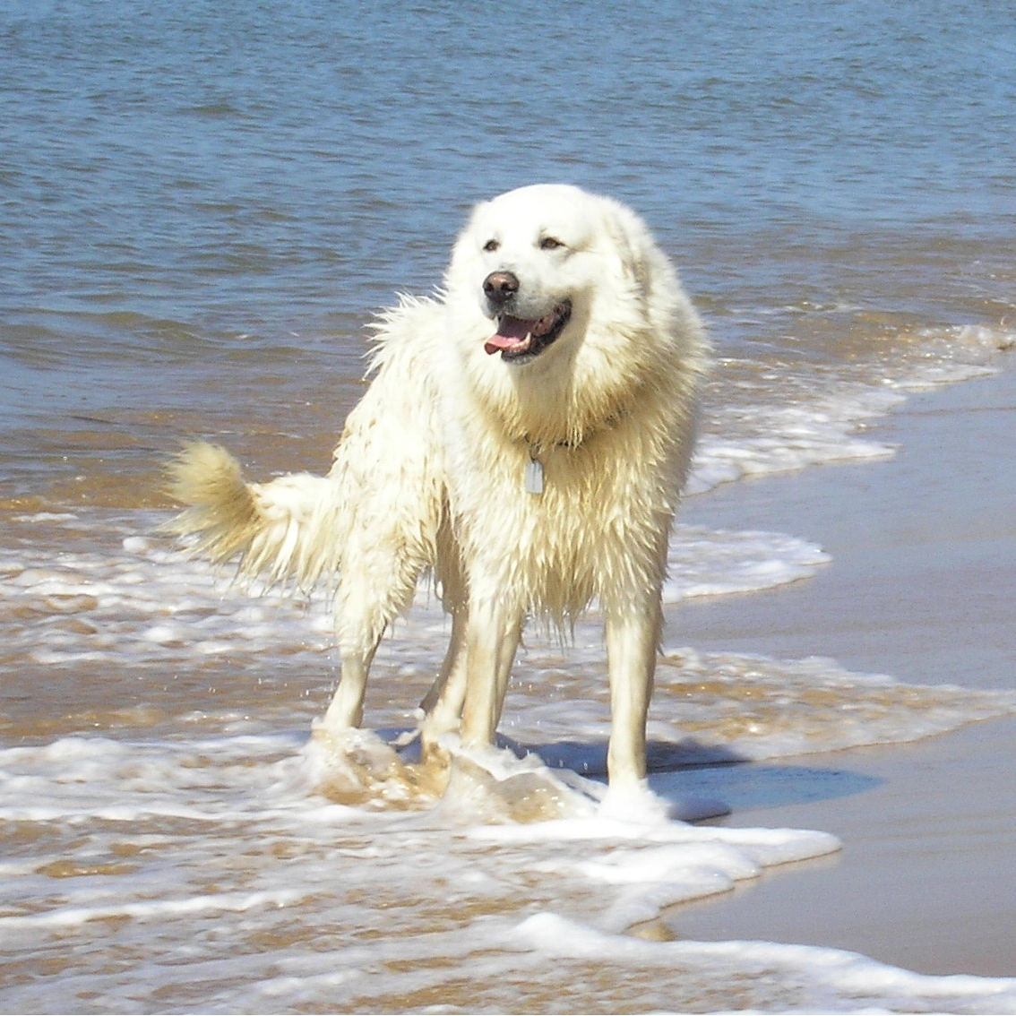 Sa grande tête rappelle plus celle de l’ours blanc que celle du chien. Ses yeux ocres ou marrons foncés ont les paupières entourées de noir. Ses oreilles tombantes en V sont triangulaires. Sa truffe est grosse et toute noire. Sa queue est basse et pendante au repos. Elle est touffue et bien fournie mais sans frange.
